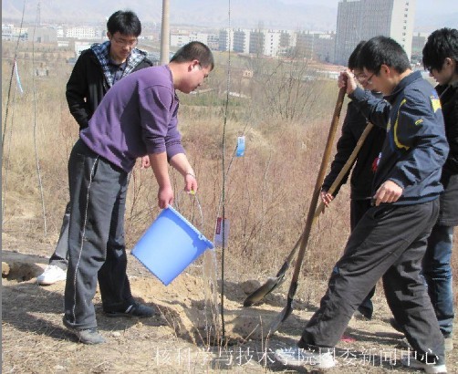 下午1:30,由生活部、2010级核物理班、2010级辐射防护班组成的植树大队在二食堂前集合完毕,向中子楼进发。到达中子楼时,本次活动的倡议者——核学院2007级中广核准员工已经开始了,同学们顿时激情高涨,拿起铁锹就干了起来。男生负责挖坑,女生负责扶树,不一会儿,一个个树坑准备就绪。同学们辛劳的汗水滑入载满希望和爱心的土壤中,纵然土地坚硬,纵然土壤中有很多石块,但大家齐心协力为小树建起了一个个舒适的家,并为它浇灌生命之水。