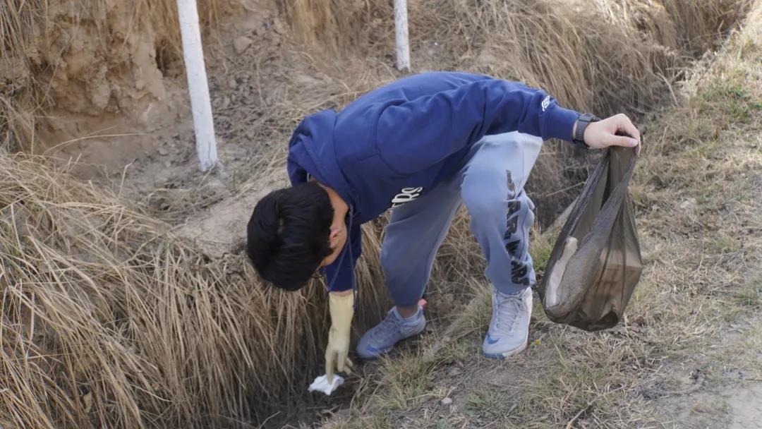 三月的萃英山还略显荒芜,在爬山过程中偶尔也会尘土飞扬。志愿者们拿出了提前准备好的塑料袋与手套,带好了口罩,不嫌脏、不怕累,弯腰将沿途地面和草丛中的烟头、纸巾、塑料瓶、食品包装袋等一一清理干净。